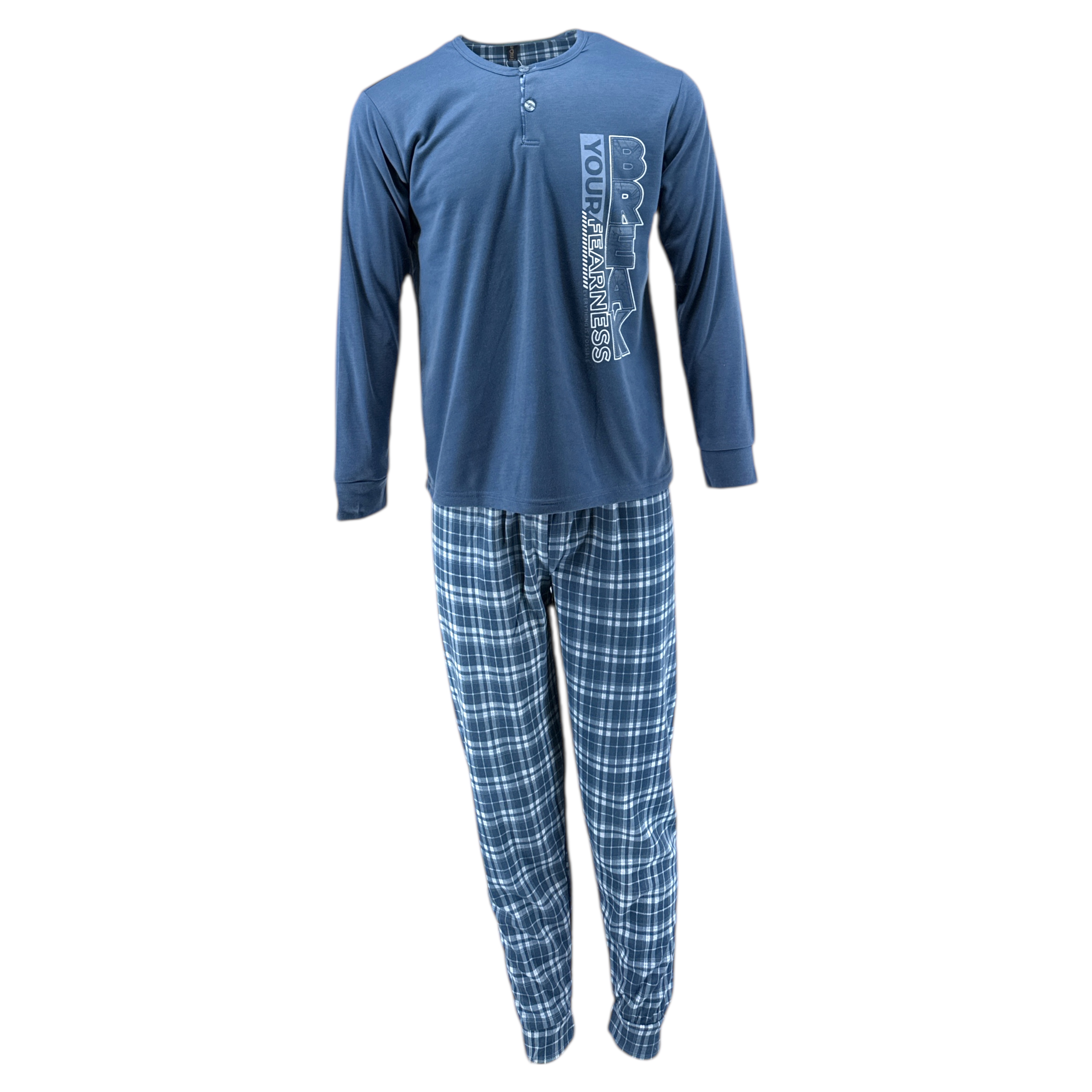 Πιτζάμα Ανδρική 2τμχ μπλούζα με κουμπιά και τύπωμα, παντελόνι καρό με λάστιχο στο τελείωμα