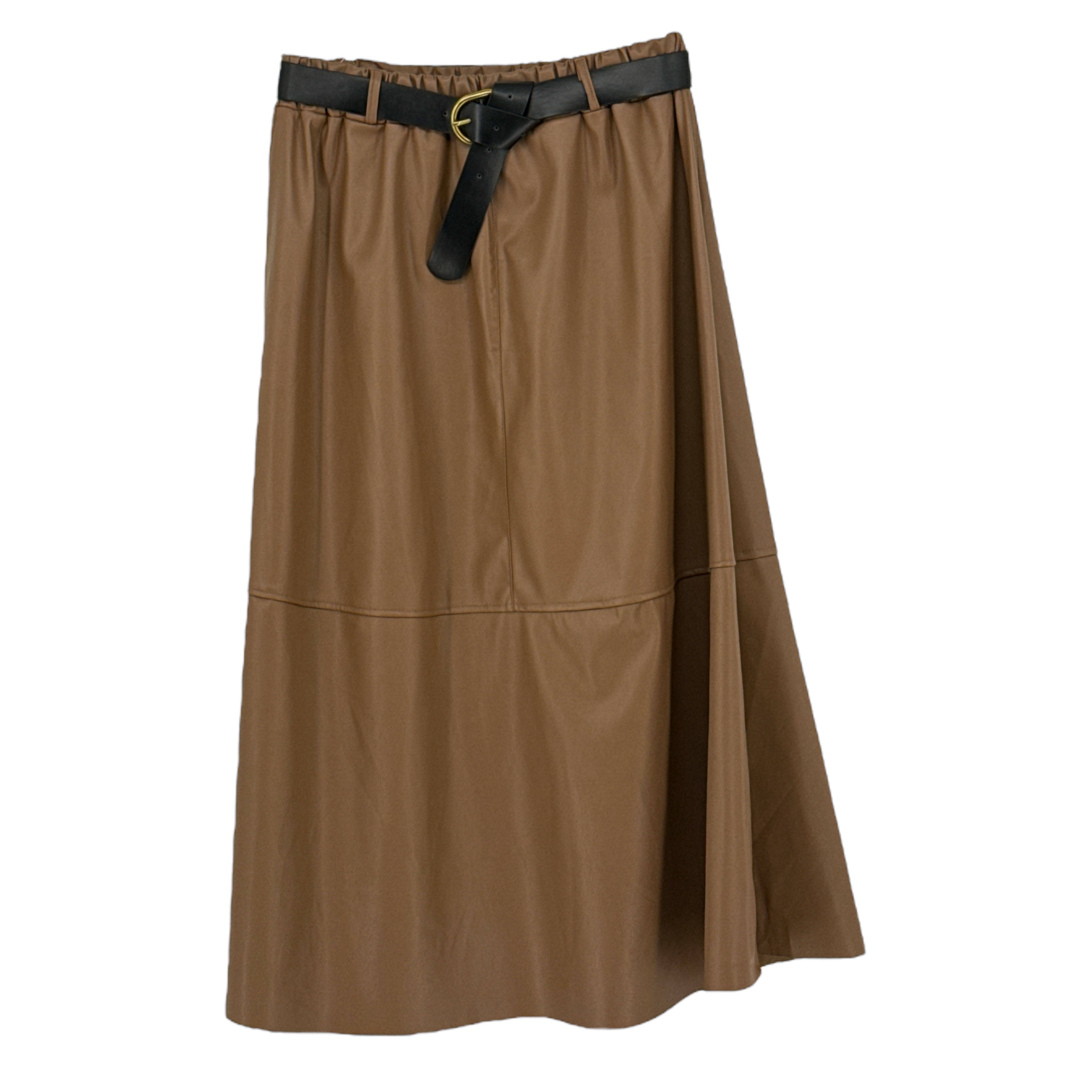 Φούστα Γυναικεία 7953 μονόχρωμη δερματίνη με λάστιχο στη μέση και αποσπώμενη ζώνη σε κλος γραμμή. One size καλύπτει μεσαία και μεγάλα μεγέθη.