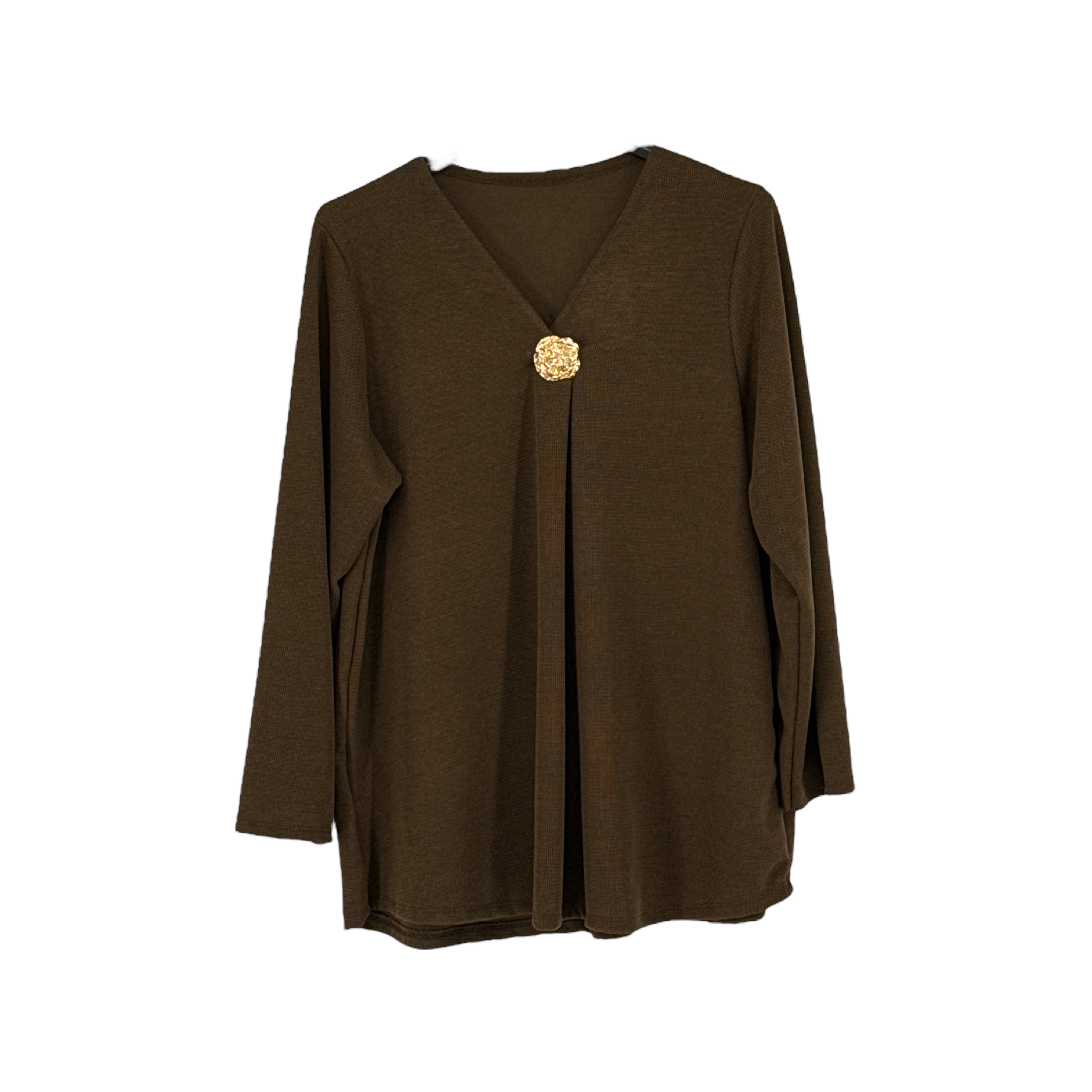 Μπλούζα Γυναικεία μονόχρωμη σε V με κόσμημα καρφίτσα αποσπώμενη που δημιουργεί πιετάκι κομψότατο μπροστά. Είναι σε ανάγλθφη λεπτή πλεκτή ύφανση one size oversized και καλύπτει μεγάλα μεγέθη.