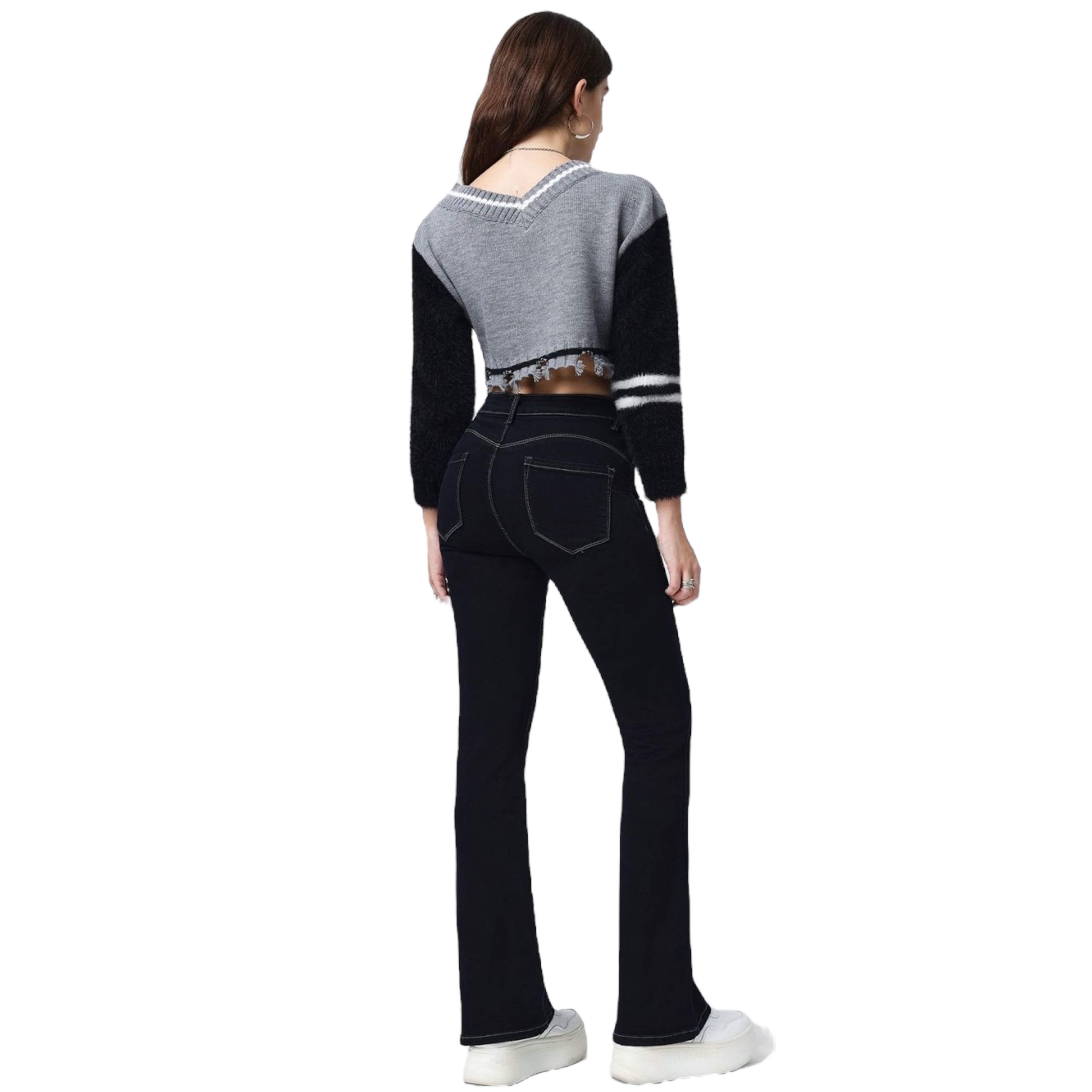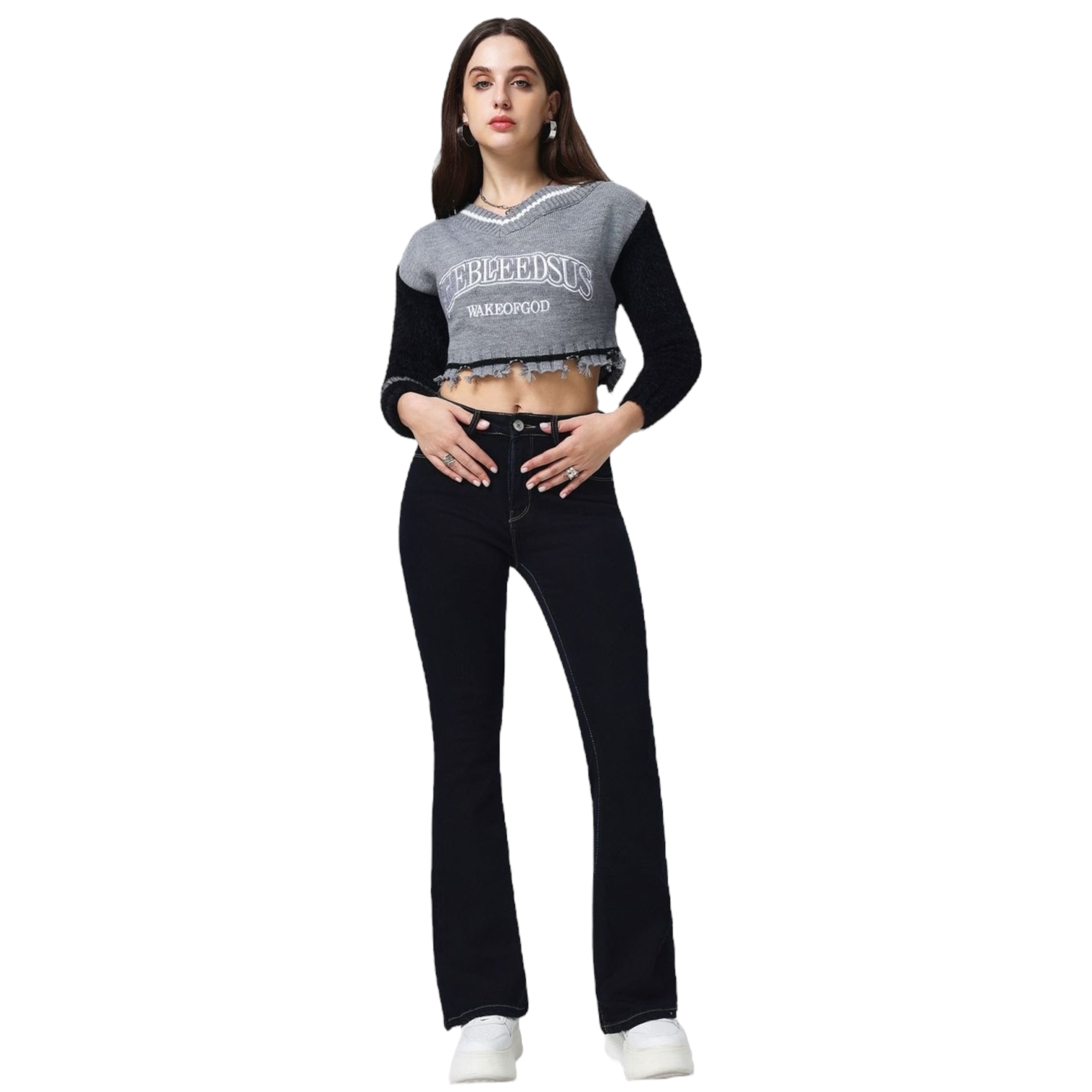 Jean Παντελόνι Γυναικείο ψηλόμεσο με διπλή ελαστικότητα σε blue black απόχρωση εξώραφα πολύ μοντέρνο σε γραμμή καμπάνα. Καλύπτει μεσαία μεγέθη.