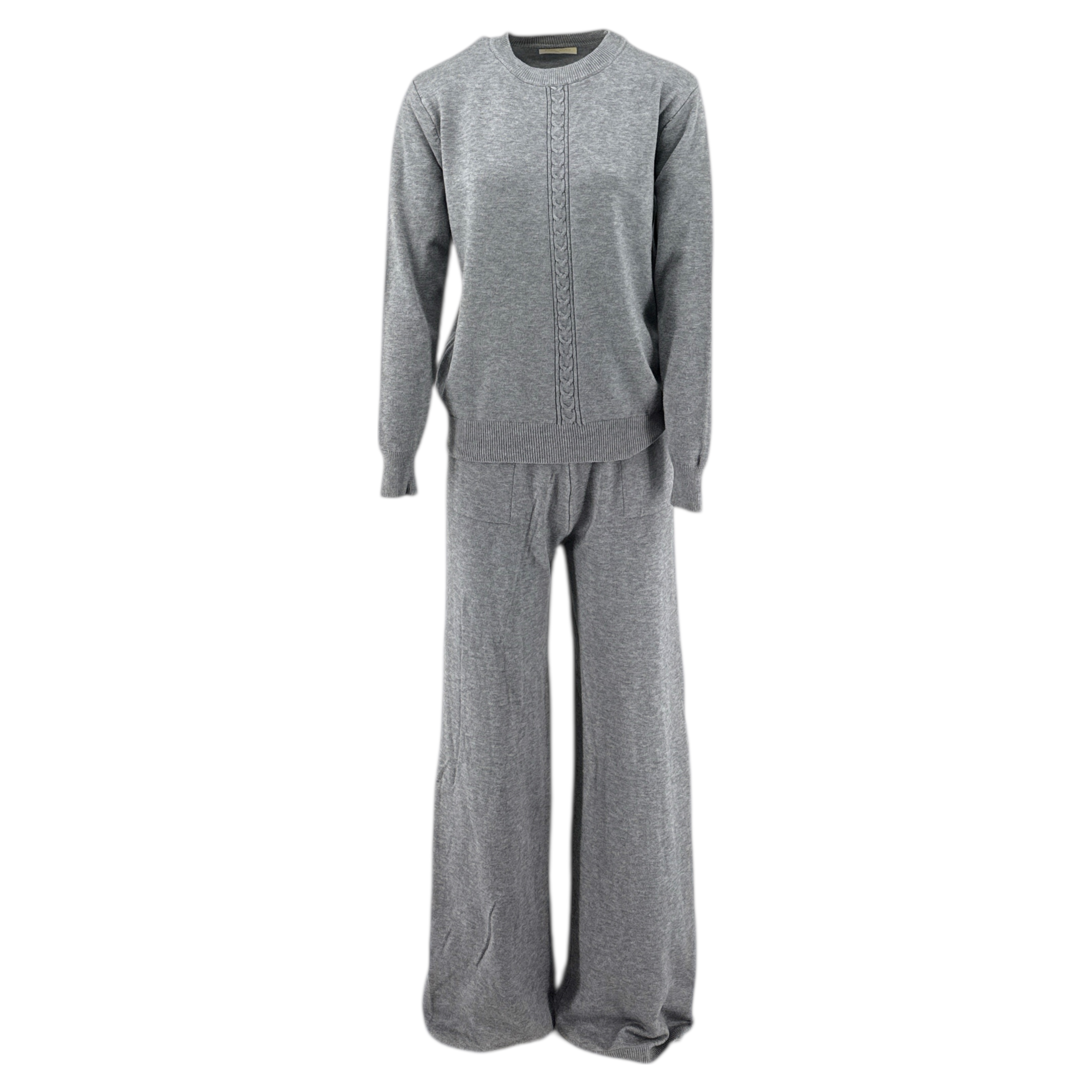 Σετ Πλεκτό Γυναικείο C280 μονόχρωμο σε ίσια λεπτή στρωτή πλέξη με μια λεπτή πλεξούδα μπροστά στη μπλούζα. Η παντελόνα έχει λάστιχο και κορδόνι και δύο λοξές τσέπες.