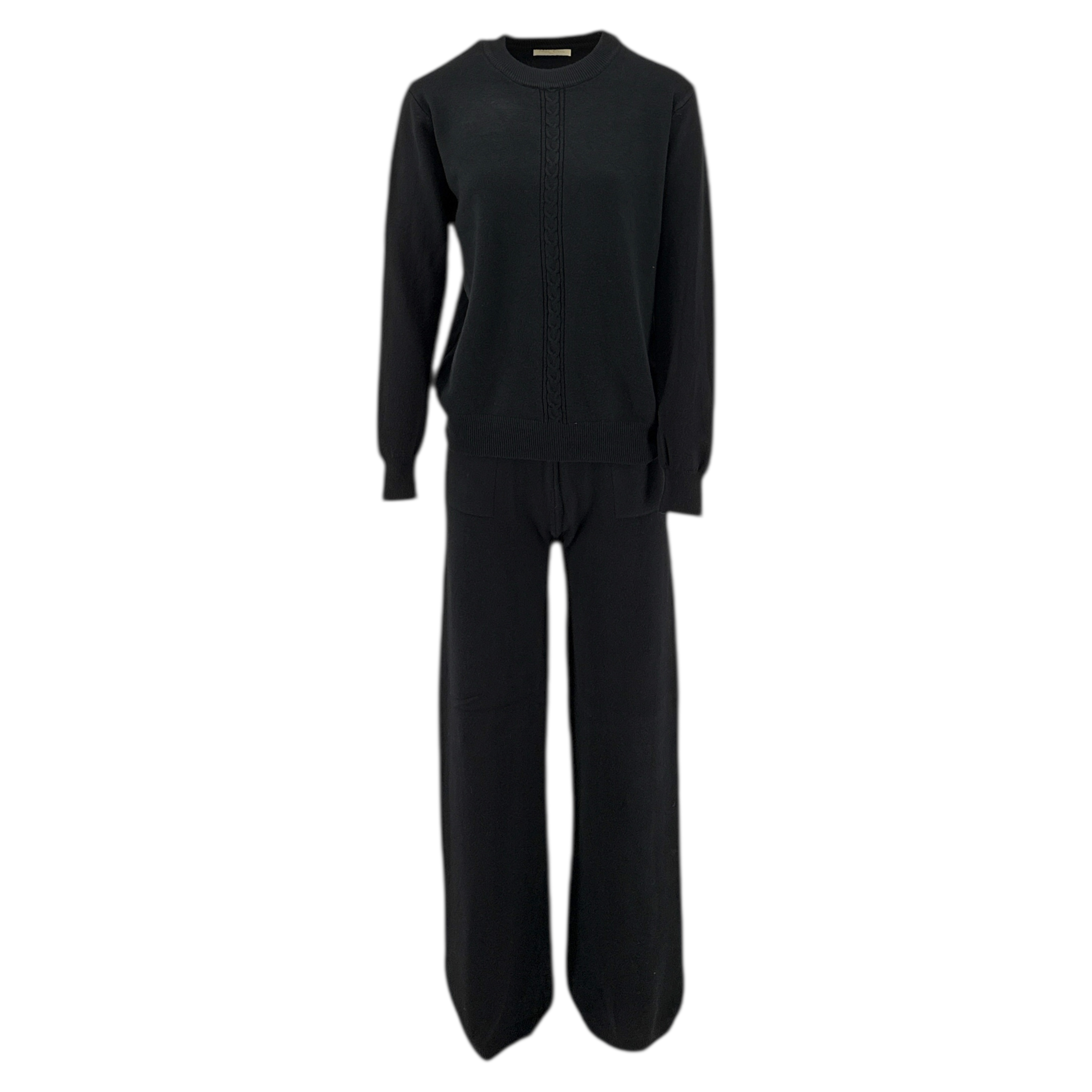 Σετ Πλεκτό Γυναικείο μονόχρωμο σε ίσια λεπτή στρωτή πλέξη με μια λεπτή πλεξούδα μπροστά στη μπλούζα. Η παντελόνα έχει λάστιχο και κορδόνι και δύο λοξές τσέπες.