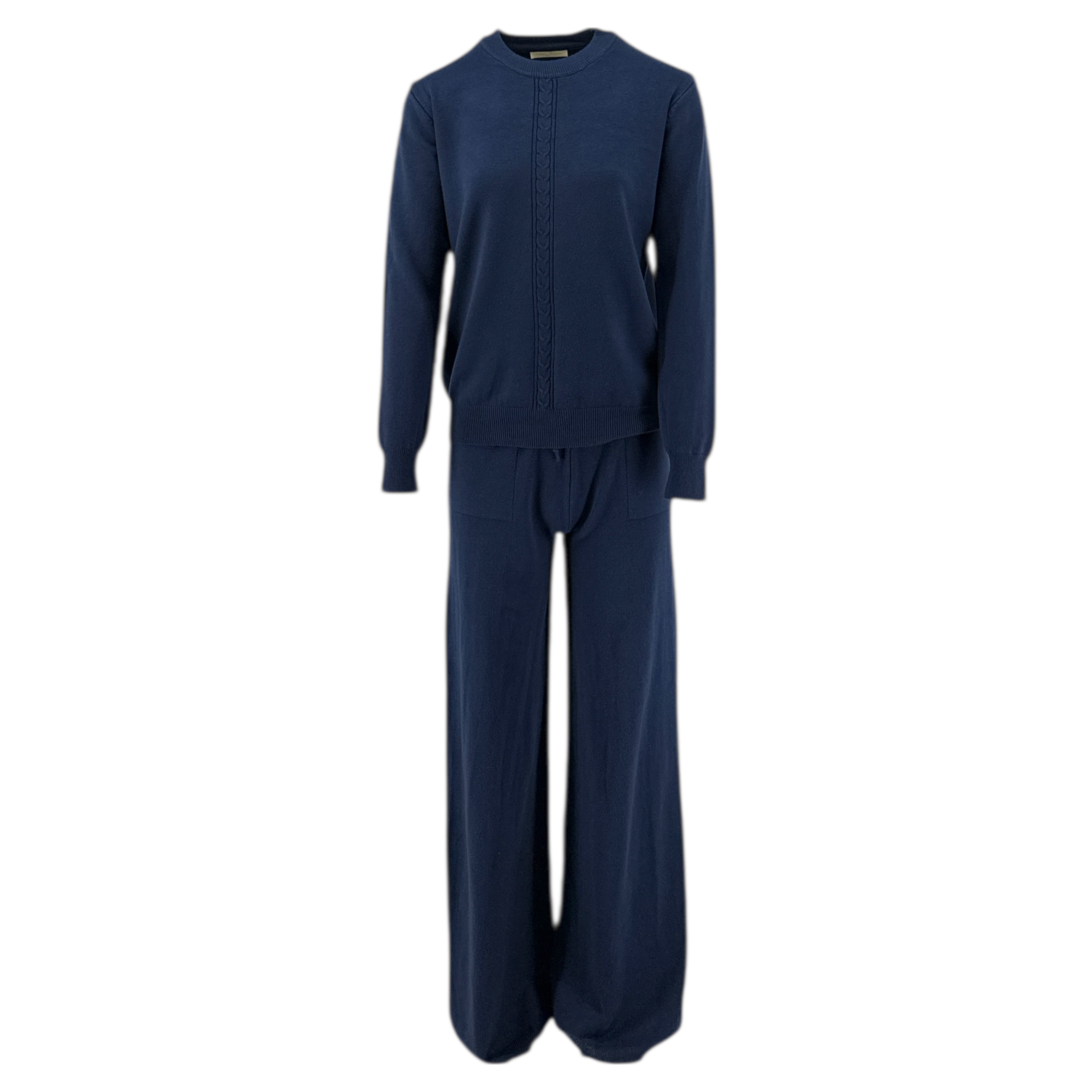 Σετ Πλεκτό Γυναικείο μονόχρωμο σε ίσια λεπτή στρωτή πλέξη με μια λεπτή πλεξούδα μπροστά στη μπλούζα. Η παντελόνα έχει λάστιχο και κορδόνι και δύο λοξές τσέπες.