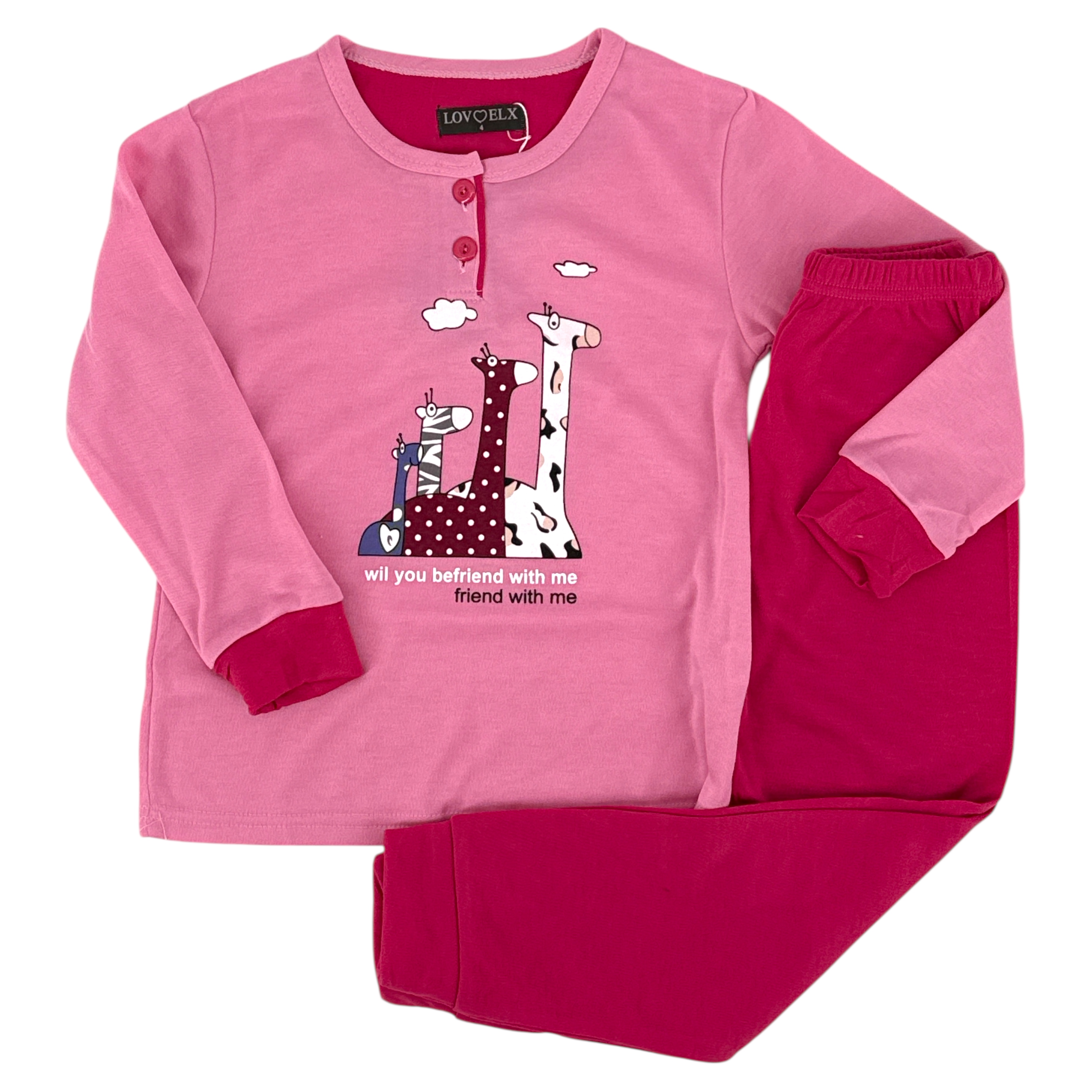 Πιτζάμα Παιδική Για Κορίτσι F1895 2τμχ μπλούζα λαιμόκοψη με κουμπιά και τύπωμα, παντελόνι μονόχρωμο με λάστιχο στη μέση.